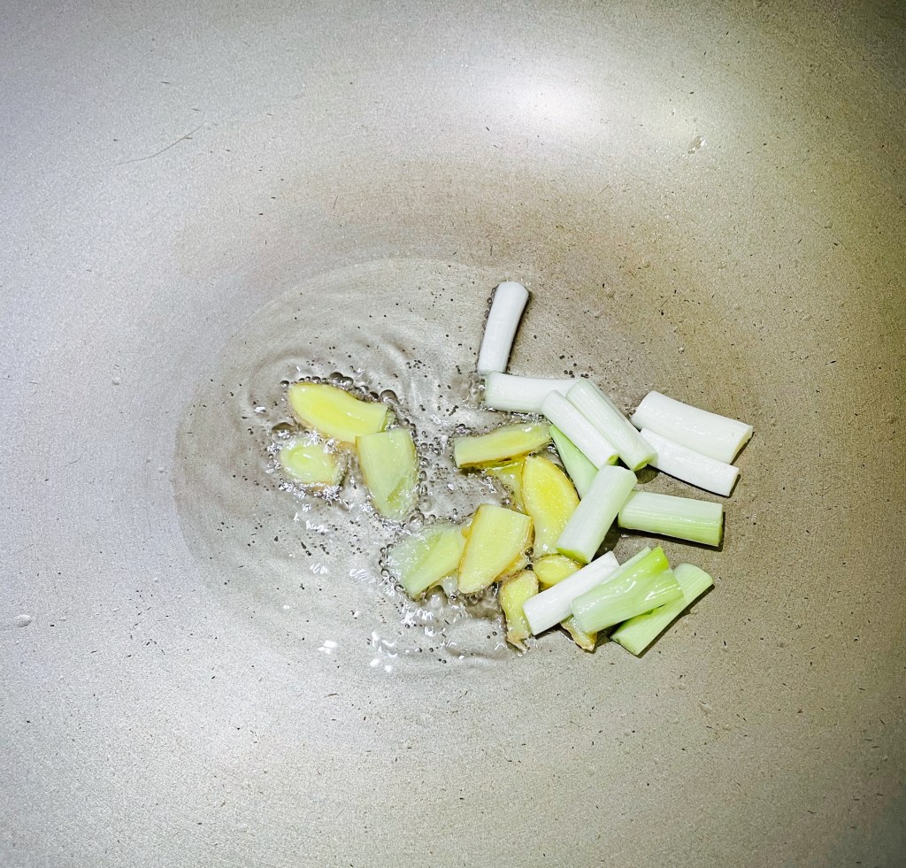 3.鍋中倒入1大匙油,開火後加入蔥白及薑片煸香。