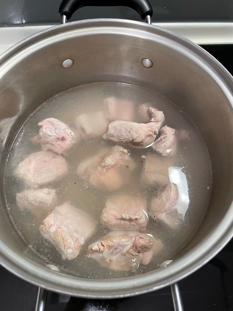 2.除去雜質:煮一鍋滾水,將排骨放入燙到表面變白即可撈出。
