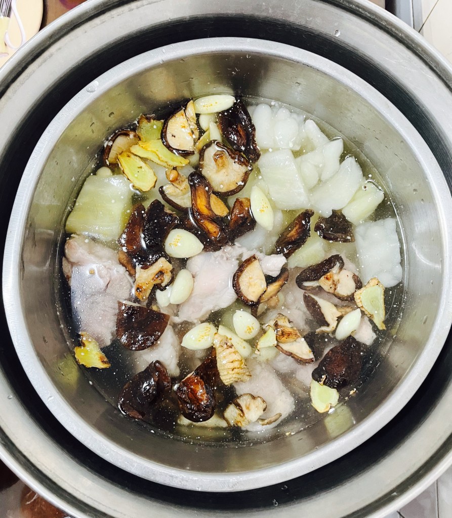 5.將炒香的香菇、蒜頭和薑片放入內鍋,再加入鳳梨罐頭,加水淹過所有食材。外鍋放3杯水。待電鍋跳起後再酌量加入調味料。
