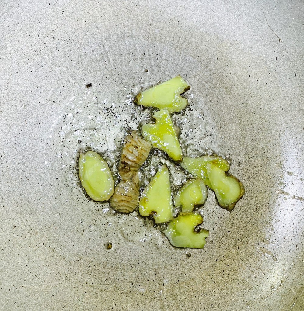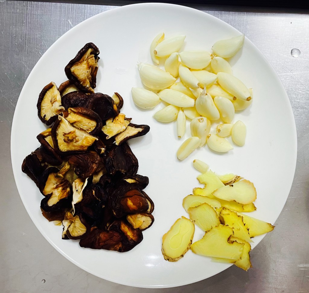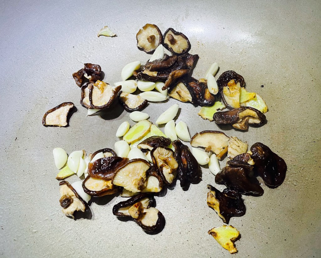 4.開中小火,鍋中下1湯匙油,放入薑片爆香,待薑片變白後,再加入香菇和蒜頭一起炒香即可熄火。