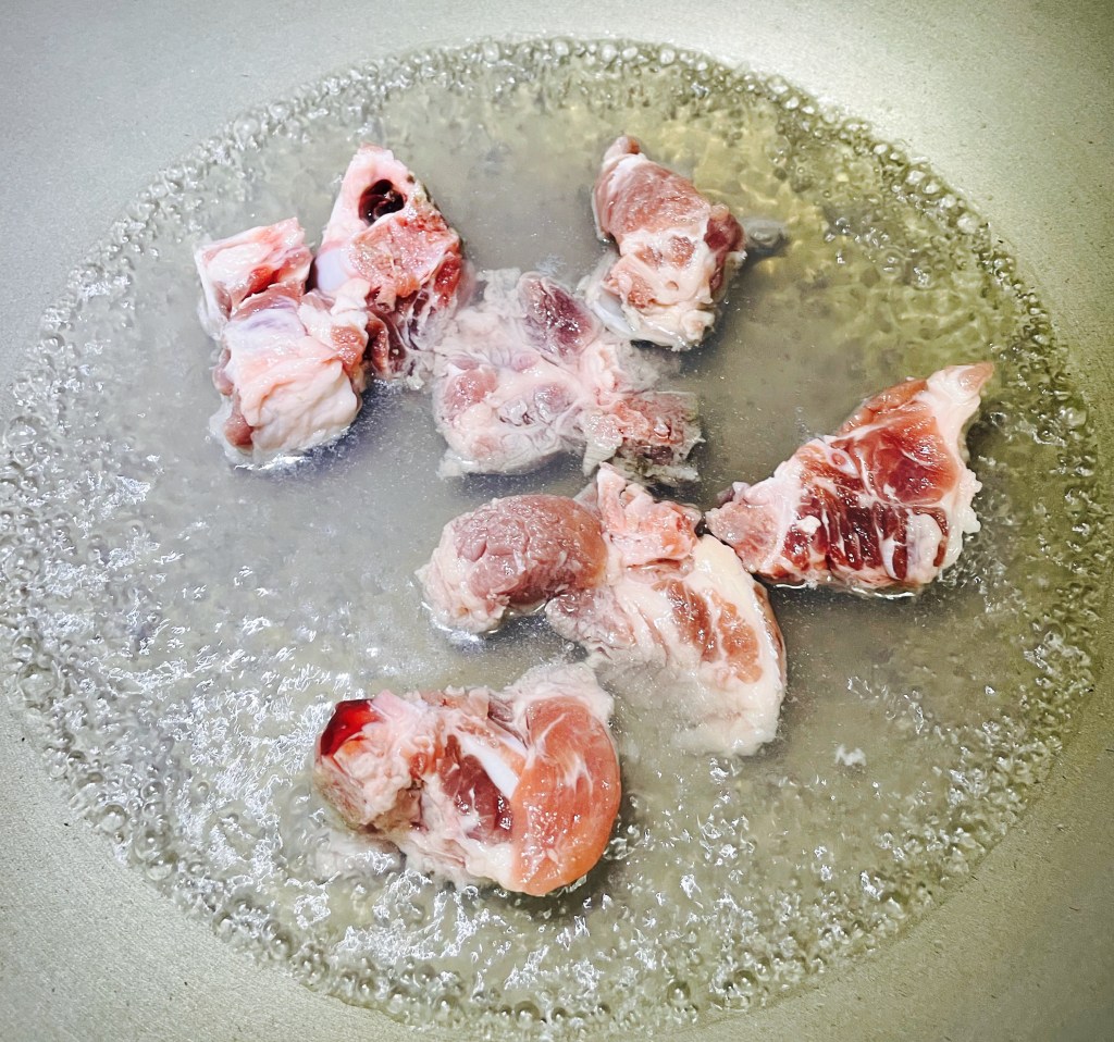 2.鍋中水煮滾後放入排骨,將排骨川燙至表面變白即可撈起。
