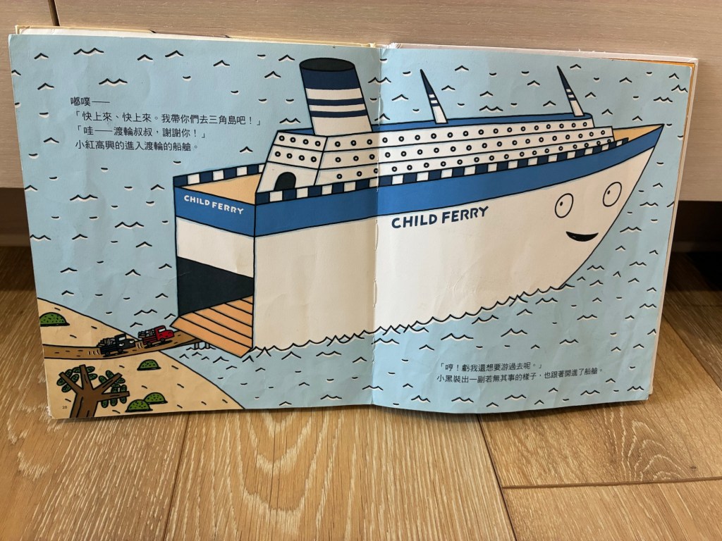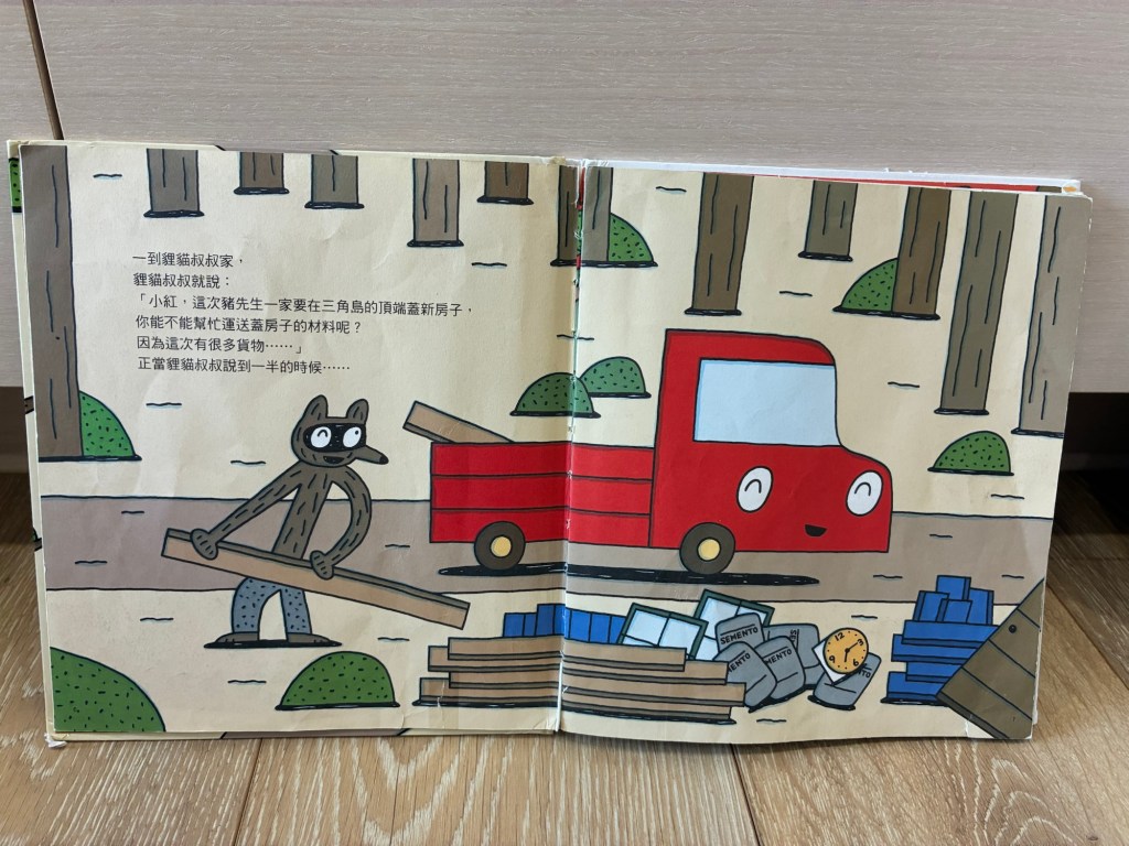 故事中主角是兩台個性不同但是都很善良的小貨車,一起送蓋房子的材料到三角島上豬先生家的故事。故事中的小紅個性溫暖,總是穩穩慢慢地行駛,遇事有點慌張,容易心中有小劇場,但是很快就又積極正向前進;小黑則是疾如風,表面上看起來很酷,遇事不多話,喜歡快速解決問題,像個機靈又純真的孩子,有人稱讚他會有點害羞。我喜歡宮西達也的繪畫風格,闡述的內容總是細膩又可愛。大寶在幼兒園有讀到這本書,我們後來也買了一本。大寶聽媽媽講完故事後,睡前也找了YouTube 再聽一遍,大寶曾經連續一個禮拜睡前都指定聽這個故事!
